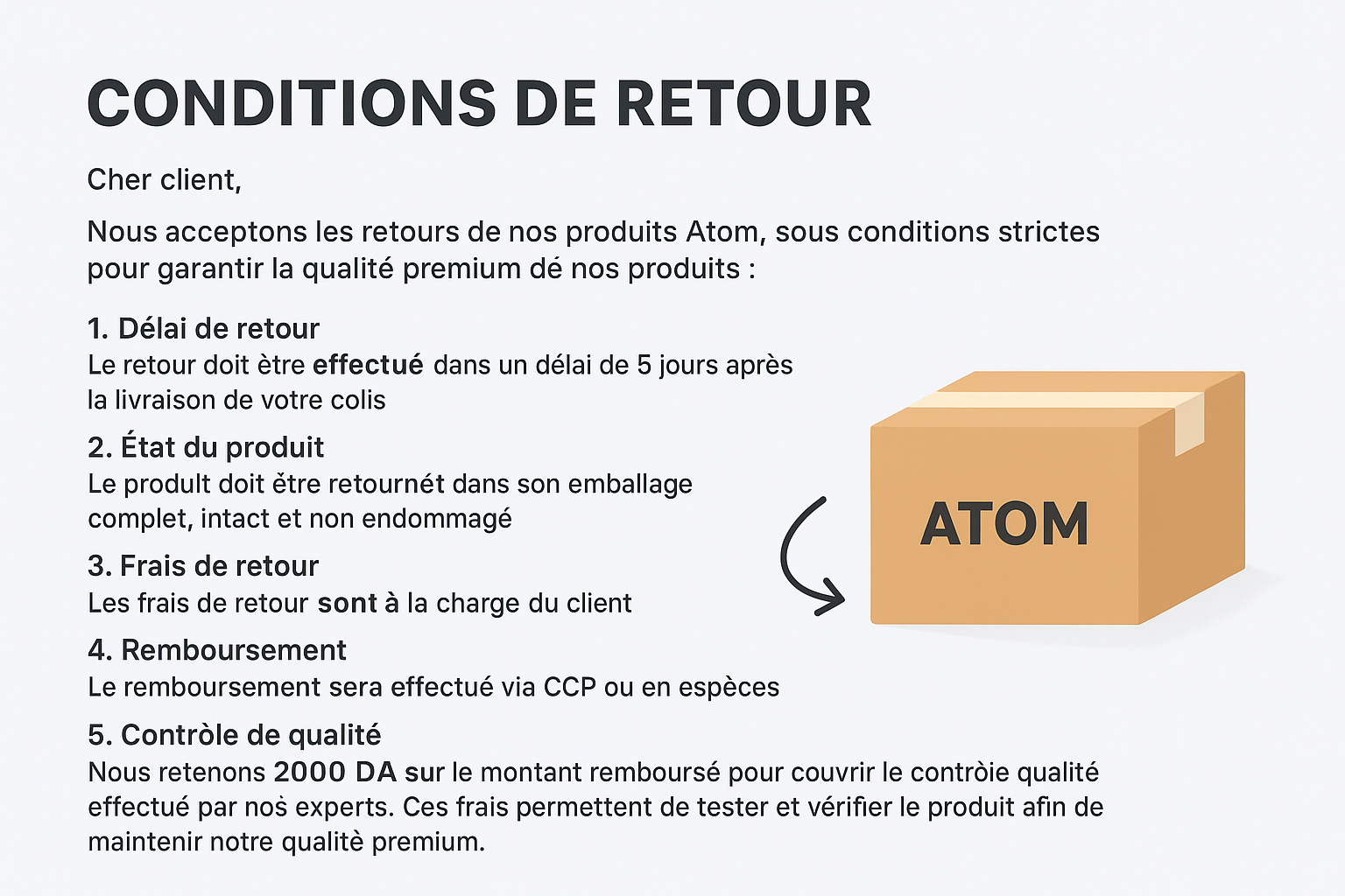 نقبل إرجاع منتجات Atom بشروط صارمة لضمان الجودة العالية ✅